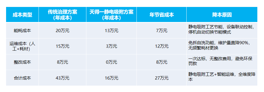 天得一深知压铸企业的成本痛点,将“降本”理念融入方案设计、设备研发全流程,依托静电吸附工艺的节能特性,从能耗、运维、资源回收三个维度,帮企业大幅降低治理成本,具体成本对比如下表(以中型压铸车间为例):