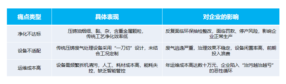 压铸废气治理的困境,本质是“工艺不匹配、设备不适配、运维高内耗”,结合行业调研数据与企业实操反馈,多数企业面临的核心痛点可总结为以下3点,具体如下表所示: