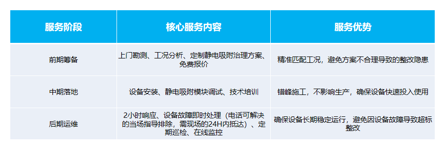 很多压铸企业反复整改、成本失控,核心是缺乏专业运维支持。天得一不仅提供搭载静电吸附工艺的高品质压铸废气处理设备,更配套全流程服务,实现从前期勘测到后期运维的全流程覆盖,具体服务体系如下表: