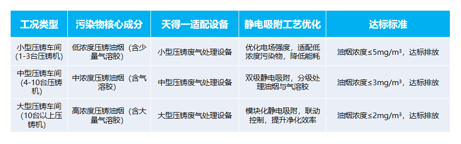 天得一打破“一刀切”治理模式,先通过上门勘测,精准掌握企业压铸机吨位、废气排放量、污染物成分(压铸油烟占比),再结合静电吸附工艺的特性,定制专属治理方案,确保压铸废气处理设备完美适配工况,具体适配标准如下表: