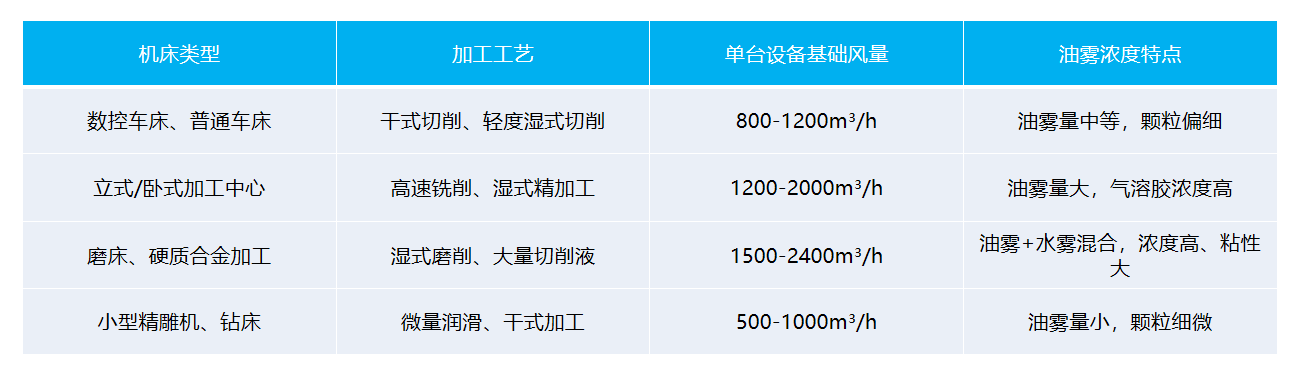 不同类型的机加工设备,油雾产生量差异极大,高速切削、湿式加工的油雾浓度远高于普通干式加工,单台设备基础风量需针对性调整,这是一拖多配比的核心基础: