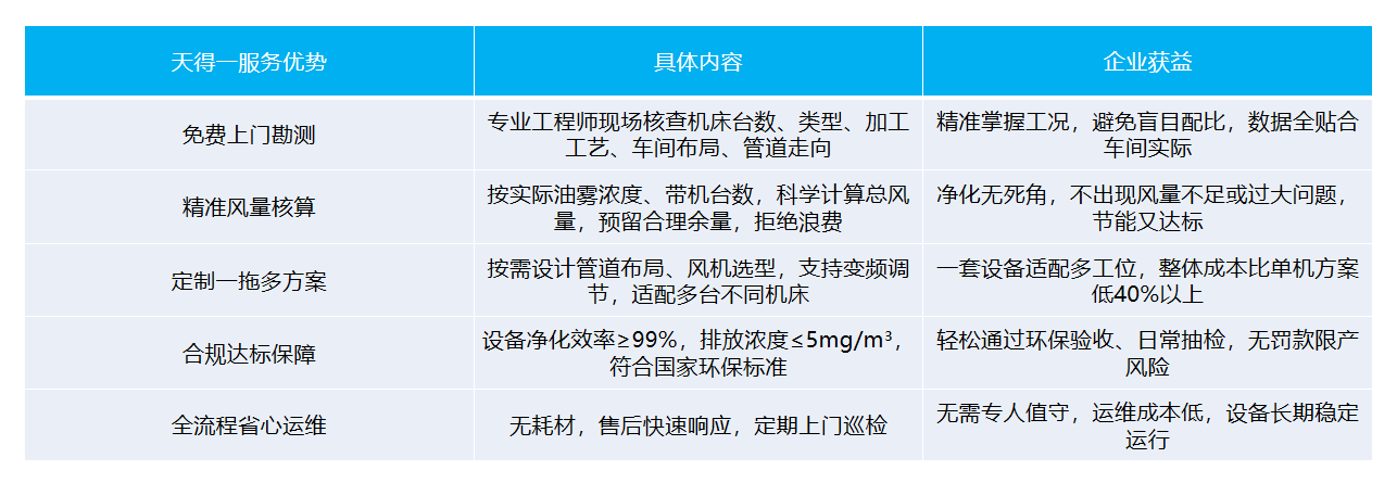 不用再纠结核算公式、不用再担心错配踩坑,天得一专注工业油雾治理多年,深谙各类机加工车间工况,针对一拖多机加工油雾净化设备,提供从勘测、配比、安装到运维的一站式服务,精准匹配台数与风量,确保净化达标、环保合规,全程省心省力,成为机加工车间油雾治理的靠谱选择。