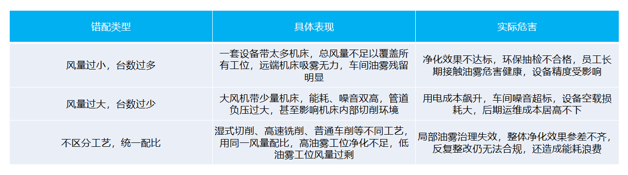 很多企业选购一拖多机加工油雾净化设备时,要么盲目按机床数量粗略估算风量,要么直接照搬同行参数,完全忽略自身车间的加工工艺、油雾浓度、设备布局、管道走向等实际工况,最终出现三大典型问题,既浪费成本,又无法合规达标: