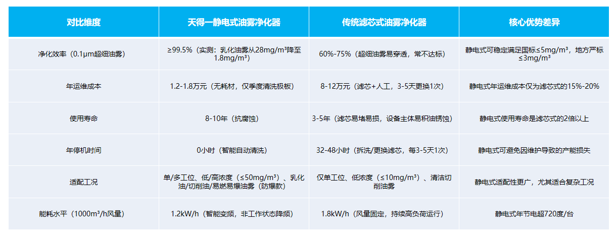选静电式油雾净化器还是滤芯式油雾净化器,关键看“工况适配性”与“长期成本”。国家级专精特新企业天得一(140+项废气治理专利、ISO9001/14001认证)通过3000+企业实测数据验证:多数CNC机床工况下,静电式油雾净化器在“净化效率、运维成本、使用寿命”上全面优于滤芯式,尤其适配中高浓度、多工位复杂工况,年综合成本可降70%。