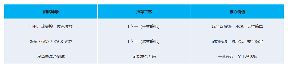 明火燃烧测试(外部火烧、整车火烧、储能柜燃烧)废气特点:900℃以上高温、烟量瞬时膨胀数千倍、含明火冲击治理要求:超强耐温耐湿、风量弹性大、电场稳定、安全可靠