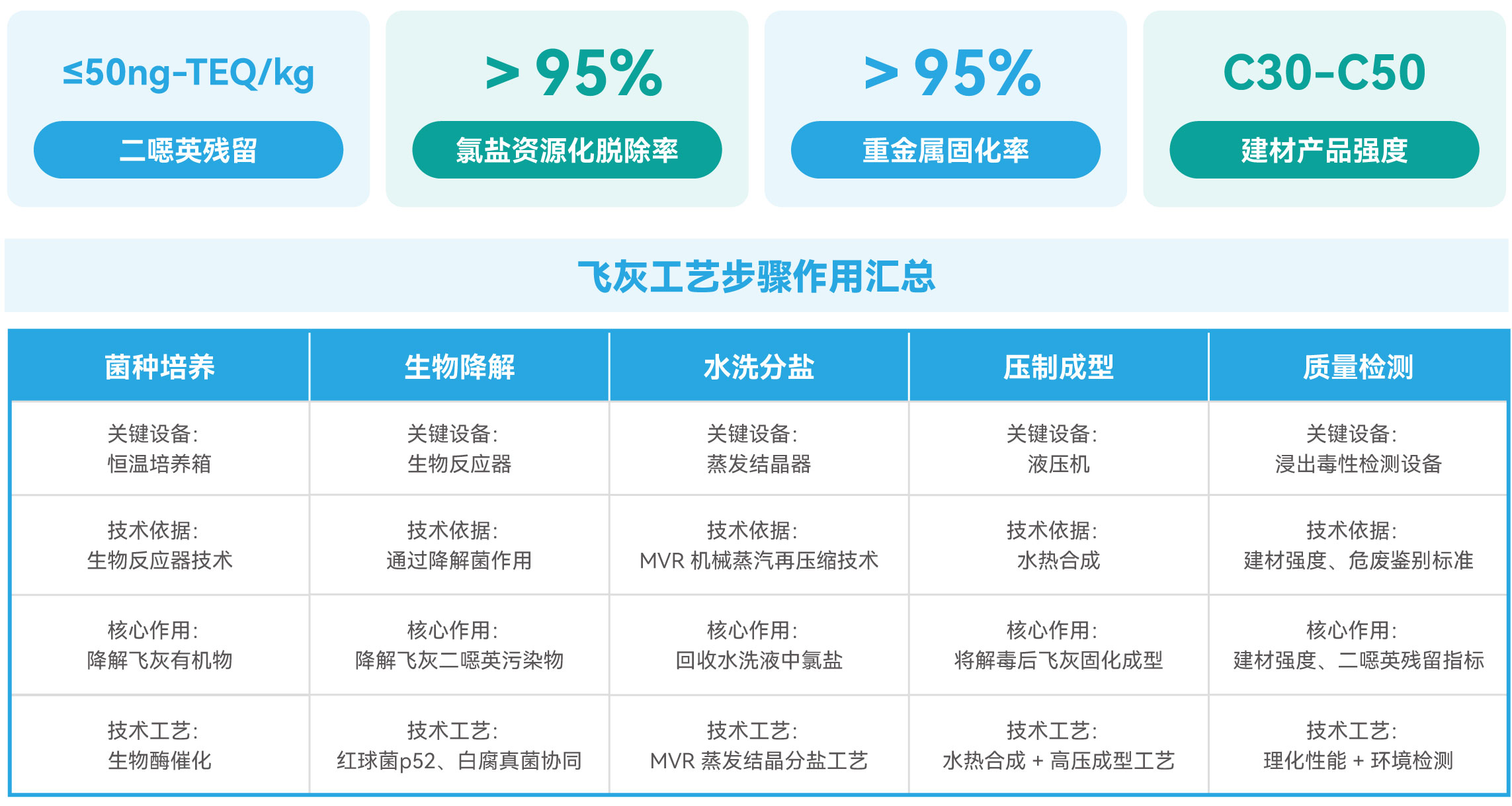 飞灰处理资源化协同以生物降解为核心,通过菌种培养、生物降解、水洗分盐、压制成型及质量检测五步工艺,实现飞灰中二噁英残留≤50ng-TEQ/kg,氯盐资源化脱除率与重金属固化率均超95%,最终产出C30-C50强度建材。工艺依托生物酶催化、MVR蒸发结晶等技术,确保解毒与资源化协同,满足建材强度与环保标准。
