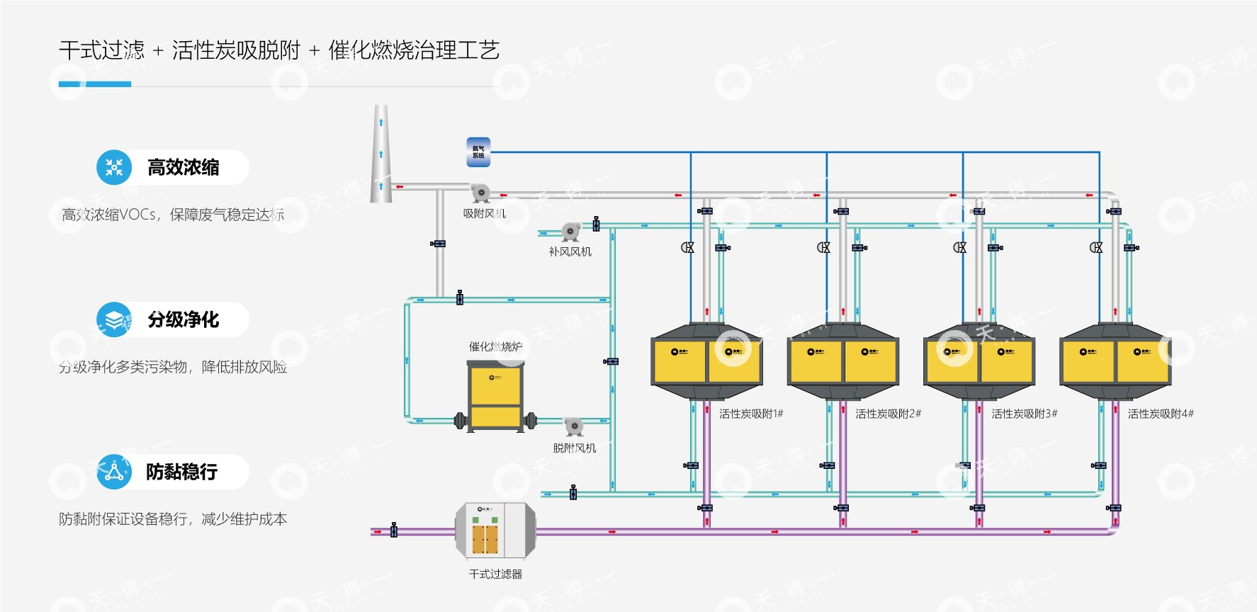 我司以兼顾预处理与深度净化,低耗高效易运维,采用“喷淋塔+干式过滤+活性炭吸附+离心机”治理工艺:通过喷淋塔拦截部分大颗粒及冷凝液滴;随后进入干式过滤,去除残留细微粉尘和黏性物质,避免堵塞后续设备;接着由活性炭吸附塔吸附 VOCs;最后经离心机确保净化后废气达标排放。
