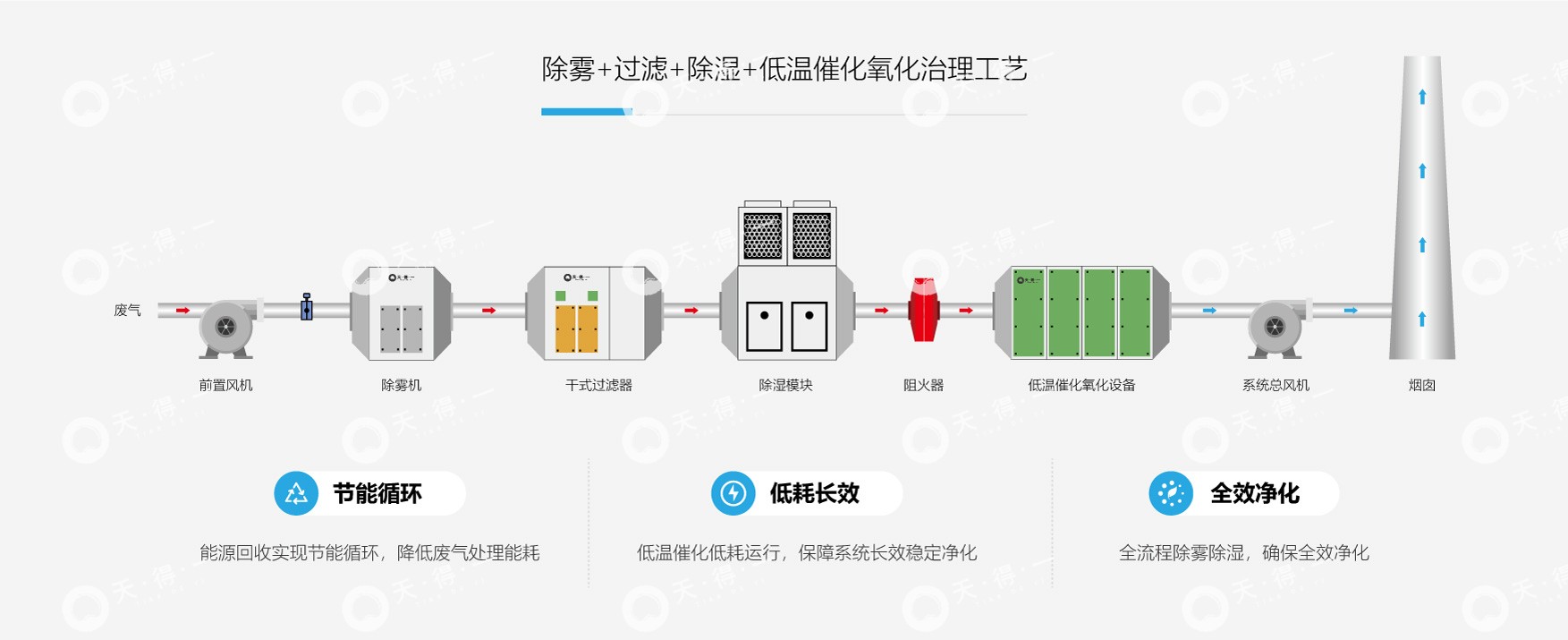 我司通过 “除雾+过滤+除湿+点热催化氧化” 的路线协同作用,既能应对浸漆废气的湿度问题,又能实现 VOCs 的高效去除与能源回收。先除雾拦截气溶胶,再过滤去细微杂质,接着除湿优化反应条件,最后低温催化氧化 VOCs 为无害物。
