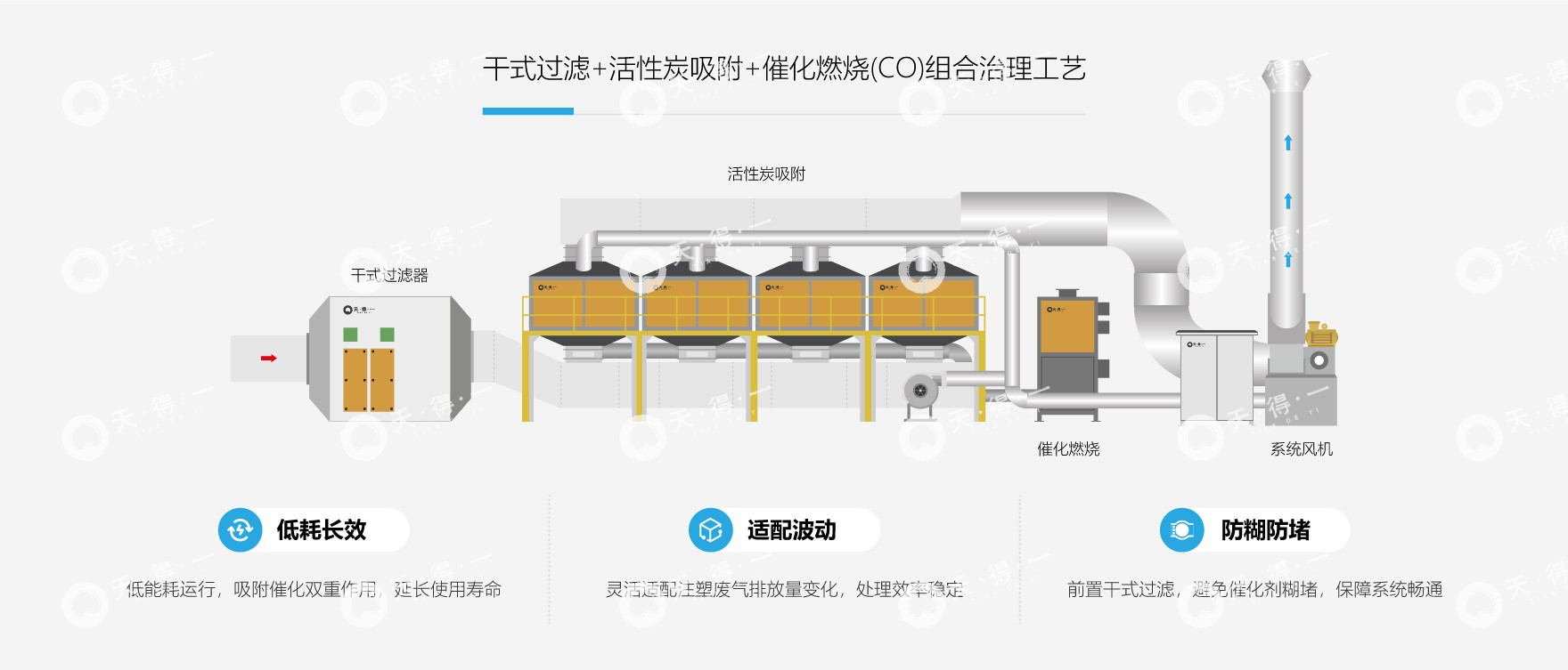 针对此类废气,我司采用“干式过滤+活性炭吸附+催化燃烧(CO)”组合工艺,构建分级净化与再生闭环系统,废气首先经多级干式过滤装置,逐级去除颗粒物,为后端工序提供保护,随后,有机组分在活性炭床层中被高效富集,实现废气持续达标排放。系统核心在于再生环节:当活性炭吸附饱和后,通过热气流对其进行脱附,产生的高浓度有机废气进入催化燃烧炉(CO),在催化剂作用下氧化为CO₂和H₂O,该过程所产生的热能可回用于脱附环节,形成“吸附—脱附—催化—回用”的闭环,在降低系统运行阻力的同时,实现能耗节约与长效稳定运行。